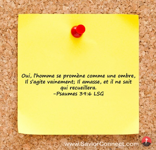 Oui, l'homme se promène comme une ombre, Il s'agite vainement; Il amasse, et il ne sait qui recueillera. -Psaumes 39:6 LSG