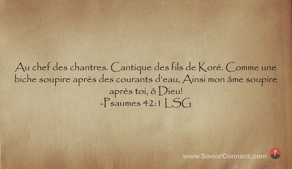 Au chef des chantres. Cantique des fils de Koré. Comme une biche soupire après des courants d'eau, Ainsi mon âme soupire après toi, ô Dieu! -Psaumes 42:1 LSG
