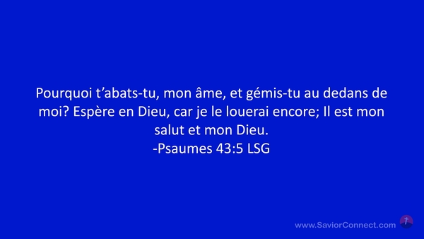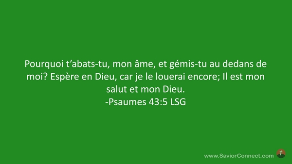 Pourquoi t'abats-tu, mon âme, et gémis-tu au dedans de moi? Espère en Dieu, car je le louerai encore; Il est mon salut et mon Dieu. -Psaumes 43:5 LSG