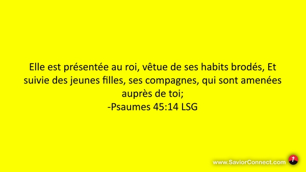 Elle est présentée au roi, vêtue de ses habits brodés, Et suivie des jeunes filles, ses compagnes, qui sont amenées auprès de toi; -Psaumes 45:14 LSG