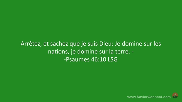 Arrêtez, et sachez que je suis Dieu: Je domine sur les nations, je domine sur la terre. - -Psaumes 46:10 LSG
