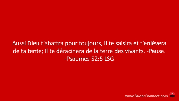 Aussi Dieu t'abattra pour toujours, Il te saisira et t'enlèvera de ta tente; Il te déracinera de la terre des vivants. -Pause. -Psaumes 52:5 LSG