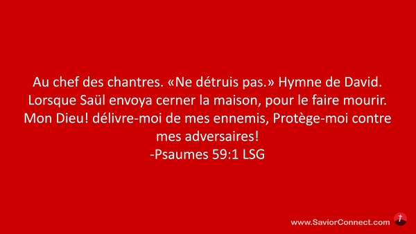 Au chef des chantres. «Ne détruis pas.» Hymne de David. Lorsque Saül envoya cerner la maison, pour le faire mourir. Mon Dieu! délivre-moi de mes ennemis, Protège-moi contre mes adversaires! -Psaumes 59:1 LSG