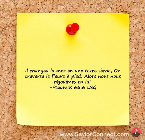 Il changea la mer en une terre sèche, On traversa le fleuve à pied: Alors nous nous réjouîmes en lui. -Psaumes 66:6 LSG