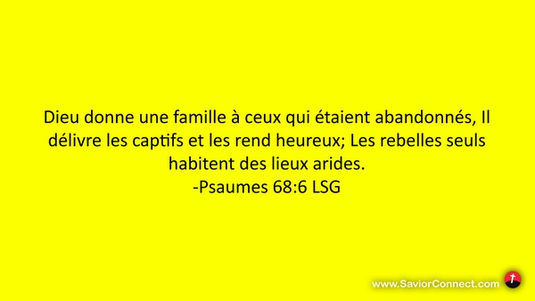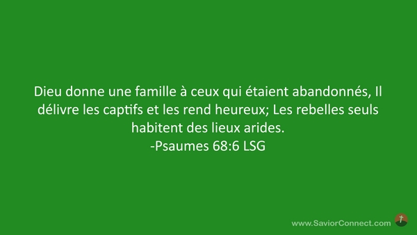 Dieu donne une famille à ceux qui étaient abandonnés, Il délivre les captifs et les rend heureux; Les rebelles seuls habitent des lieux arides. -Psaumes 68:6 LSG