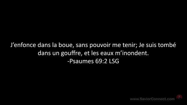 J'enfonce dans la boue, sans pouvoir me tenir; Je suis tombé dans un gouffre, et les eaux m'inondent. -Psaumes 69:2 LSG