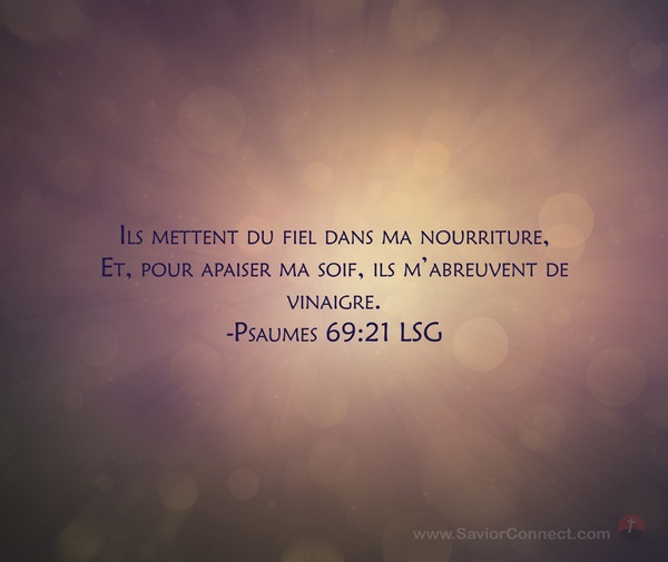 Ils mettent du fiel dans ma nourriture, Et, pour apaiser ma soif, ils m'abreuvent de vinaigre. -Psaumes 69:21 LSG