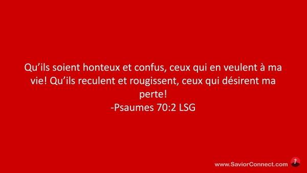 Qu'ils soient honteux et confus, ceux qui en veulent à ma vie! Qu'ils reculent et rougissent, ceux qui désirent ma perte! -Psaumes 70:2 LSG