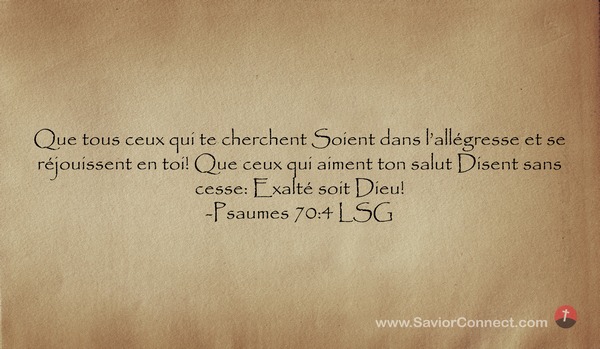Que tous ceux qui te cherchent Soient dans l'allégresse et se réjouissent en toi! Que ceux qui aiment ton salut Disent sans cesse: Exalté soit Dieu! -Psaumes 70:4 LSG