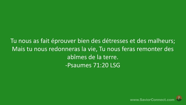 Tu nous as fait éprouver bien des détresses et des malheurs; Mais tu nous redonneras la vie, Tu nous feras remonter des abîmes de la terre. -Psaumes 71:20 LSG