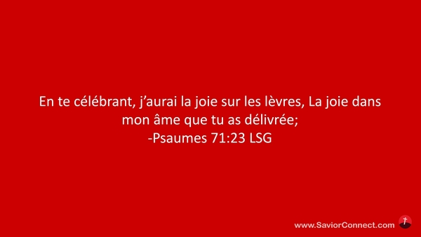 En te célébrant, j'aurai la joie sur les lèvres, La joie dans mon âme que tu as délivrée; -Psaumes 71:23 LSG
