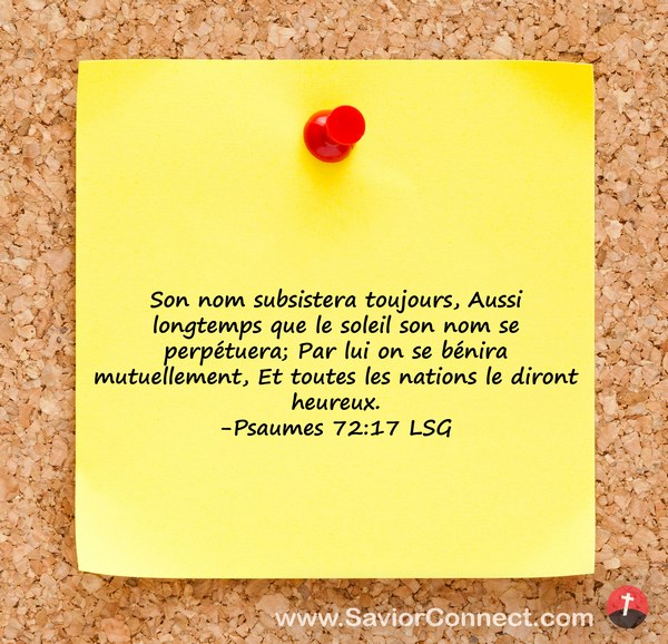 Son nom subsistera toujours, Aussi longtemps que le soleil son nom se perpétuera; Par lui on se bénira mutuellement, Et toutes les nations le diront heureux. -Psaumes 72:17 LSG