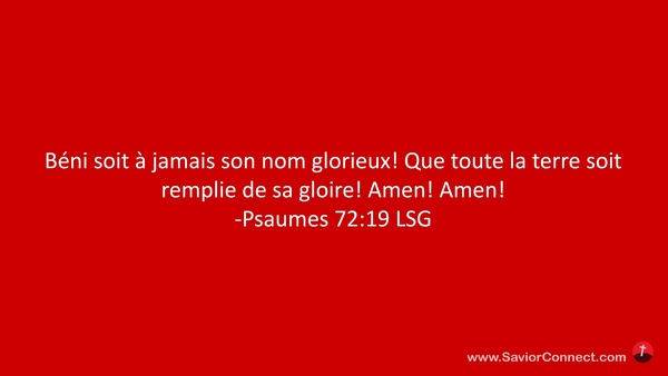 Béni soit à jamais son nom glorieux! Que toute la terre soit remplie de sa gloire! Amen! Amen! -Psaumes 72:19 LSG