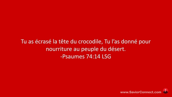 Tu as écrasé la tête du crocodile, Tu l'as donné pour nourriture au peuple du désert. -Psaumes 74:14 LSG