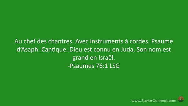 Au chef des chantres. Avec instruments à cordes. Psaume d'Asaph. Cantique. Dieu est connu en Juda, Son nom est grand en Israël. -Psaumes 76:1 LSG