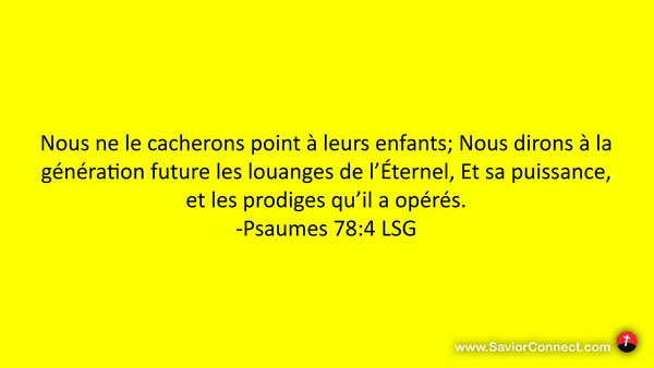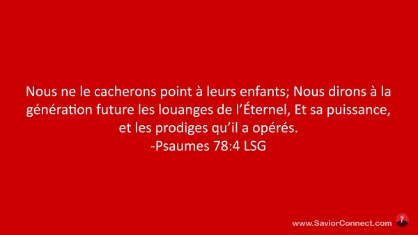 Nous ne le cacherons point à leurs enfants; Nous dirons à la génération future les louanges de l'Éternel, Et sa puissance, et les prodiges qu'il a opérés. -Psaumes 78:4 LSG
