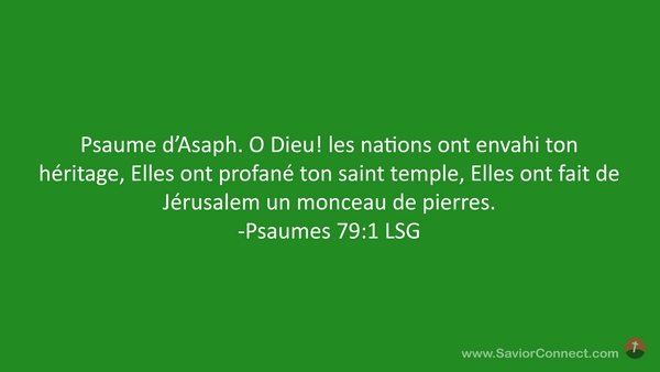 Psaume d'Asaph. O Dieu! les nations ont envahi ton héritage, Elles ont profané ton saint temple, Elles ont fait de Jérusalem un monceau de pierres. -Psaumes 79:1 LSG