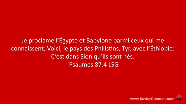 Je proclame l'Égypte et Babylone parmi ceux qui me connaissent; Voici, le pays des Philistins, Tyr, avec l'Éthiopie: C'est dans Sion qu'ils sont nés. -Psaumes 87:4 LSG