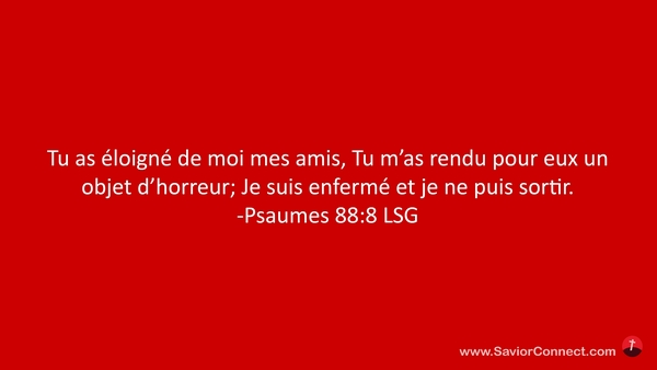 Tu as éloigné de moi mes amis, Tu m'as rendu pour eux un objet d'horreur; Je suis enfermé et je ne puis sortir. -Psaumes 88:8 LSG