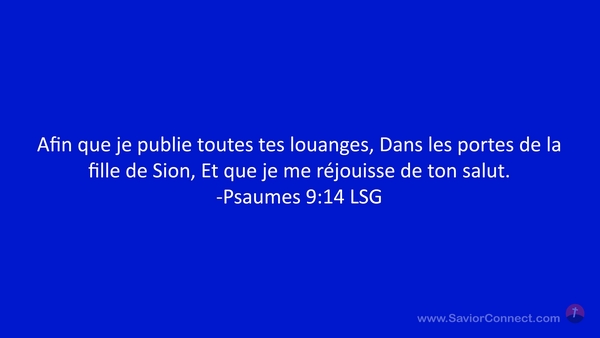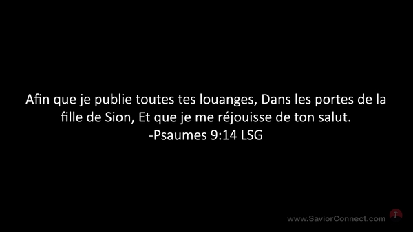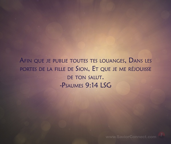 Afin que je publie toutes tes louanges, Dans les portes de la fille de Sion, Et que je me réjouisse de ton salut. -Psaumes 9:14 LSG