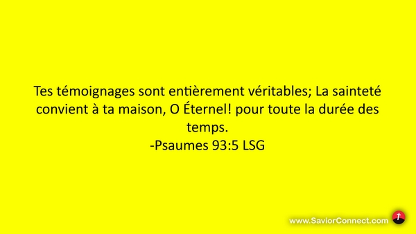 Tes témoignages sont entièrement véritables; La sainteté convient à ta maison, O Éternel! pour toute la durée des temps. -Psaumes 93:5 LSG