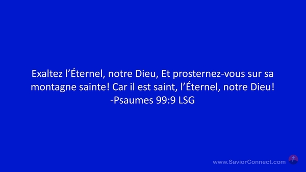 Exaltez l'Éternel, notre Dieu, Et prosternez-vous sur sa montagne sainte! Car il est saint, l'Éternel, notre Dieu! -Psaumes 99:9 LSG