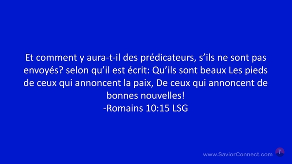 Et comment y aura-t-il des prédicateurs, s'ils ne sont pas envoyés? selon qu'il est écrit: Qu'ils sont beaux Les pieds de ceux qui annoncent la paix, De ceux qui annoncent de bonnes nouvelles! -Romains 10:15 LSG