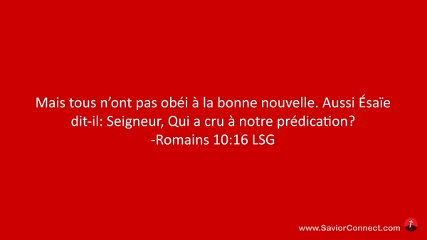 Mais tous n'ont pas obéi à la bonne nouvelle. Aussi Ésaïe dit-il: Seigneur, Qui a cru à notre prédication? -Romains 10:16 LSG