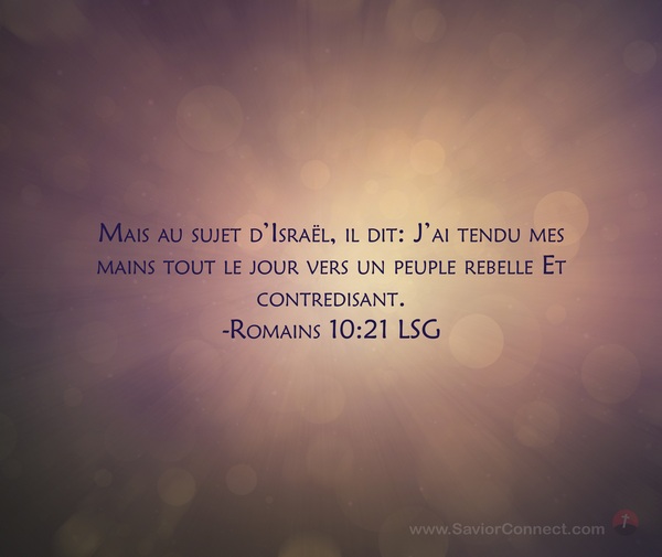 Mais au sujet d'Israël, il dit: J'ai tendu mes mains tout le jour vers un peuple rebelle Et contredisant. -Romains 10:21 LSG