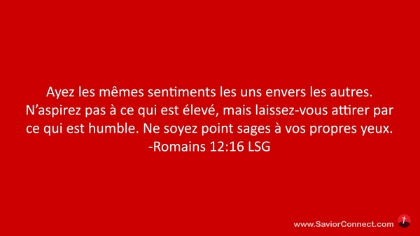 Ayez les mêmes sentiments les uns envers les autres. N'aspirez pas à ce qui est élevé, mais laissez-vous attirer par ce qui est humble. Ne soyez point sages à vos propres yeux. -Romains 12:16 LSG