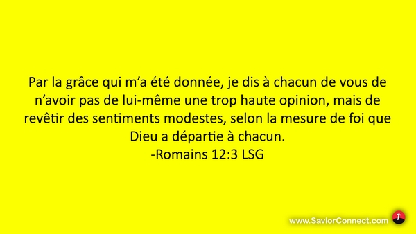 Par la grâce qui m'a été donnée, je dis à chacun de vous de n'avoir pas de lui-même une trop haute opinion, mais de revêtir des sentiments modestes, selon la mesure de foi que Dieu a départie à chacun. -Romains 12:3 LSG