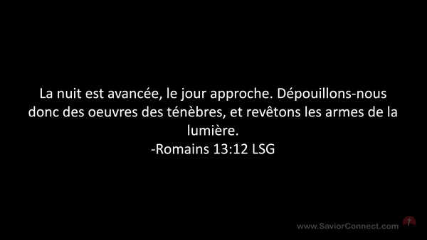 La nuit est avancée, le jour approche. Dépouillons-nous donc des oeuvres des ténèbres, et revêtons les armes de la lumière. -Romains 13:12 LSG
