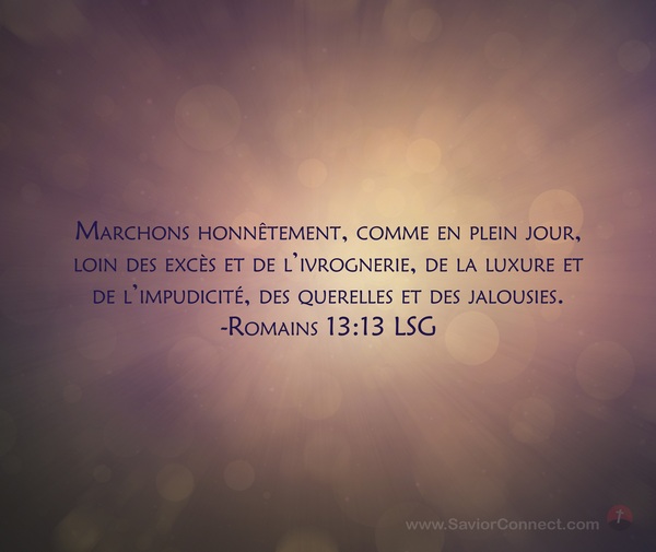 Marchons honnêtement, comme en plein jour, loin des excès et de l'ivrognerie, de la luxure et de l'impudicité, des querelles et des jalousies. -Romains 13:13 LSG