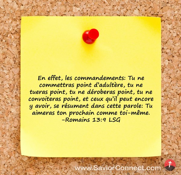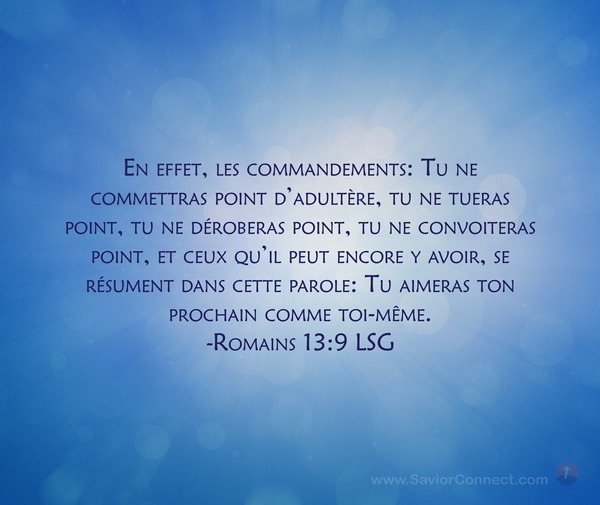 En effet, les commandements: Tu ne commettras point d'adultère, tu ne tueras point, tu ne déroberas point, tu ne convoiteras point, et ceux qu'il peut encore y avoir, se résument dans cette parole: Tu aimeras ton prochain comme toi-même. -Romains 13:9 LSG