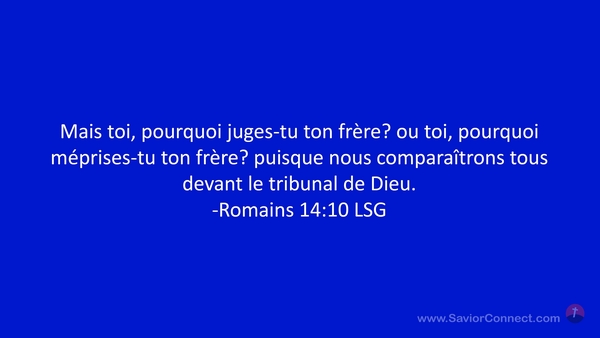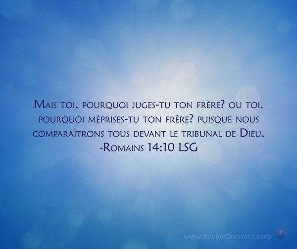 Mais toi, pourquoi juges-tu ton frère? ou toi, pourquoi méprises-tu ton frère? puisque nous comparaîtrons tous devant le tribunal de Dieu. -Romains 14:10 LSG