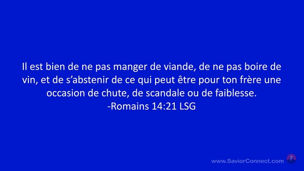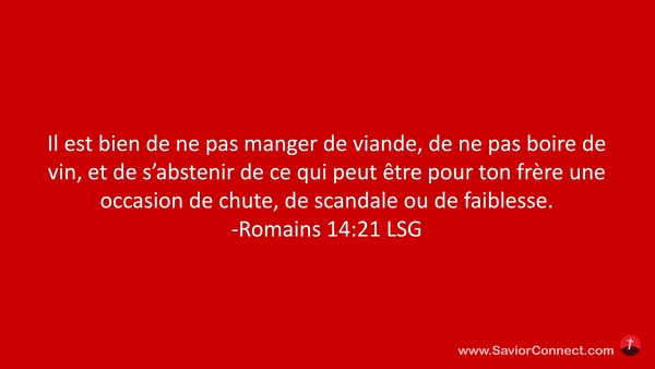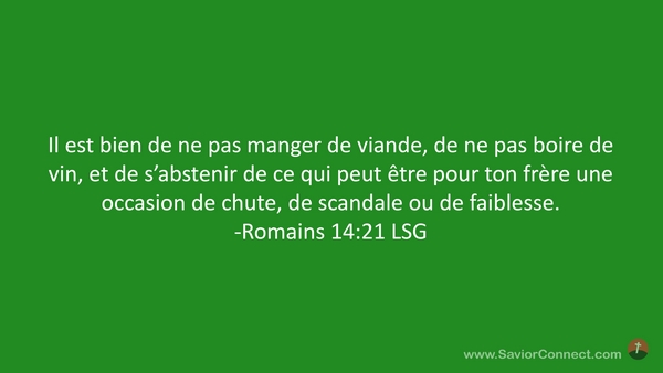 Il est bien de ne pas manger de viande, de ne pas boire de vin, et de s'abstenir de ce qui peut être pour ton frère une occasion de chute, de scandale ou de faiblesse. -Romains 14:21 LSG