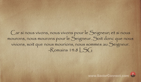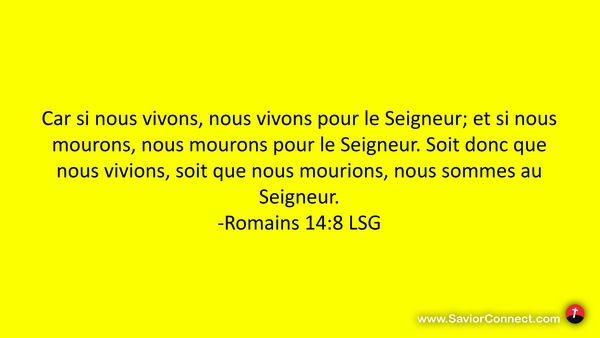 Car si nous vivons, nous vivons pour le Seigneur; et si nous mourons, nous mourons pour le Seigneur. Soit donc que nous vivions, soit que nous mourions, nous sommes au Seigneur. -Romains 14:8 LSG