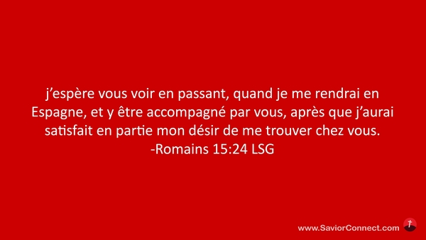 j'espère vous voir en passant, quand je me rendrai en Espagne, et y être accompagné par vous, après que j'aurai satisfait en partie mon désir de me trouver chez vous. -Romains 15:24 LSG