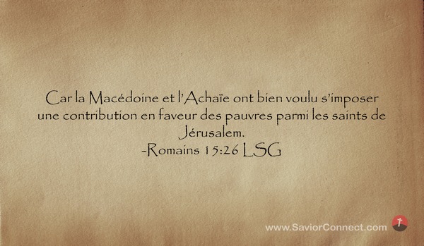 Car la Macédoine et l'Achaïe ont bien voulu s'imposer une contribution en faveur des pauvres parmi les saints de Jérusalem. -Romains 15:26 LSG