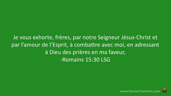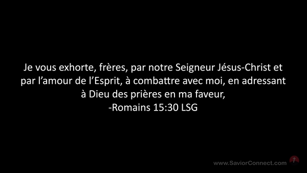 Je vous exhorte, frères, par notre Seigneur Jésus-Christ et par l'amour de l'Esprit, à combattre avec moi, en adressant à Dieu des prières en ma faveur, -Romains 15:30 LSG