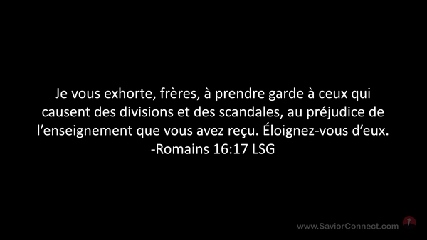 Je vous exhorte, frères, à prendre garde à ceux qui causent des divisions et des scandales, au préjudice de l'enseignement que vous avez reçu. Éloignez-vous d'eux. -Romains 16:17 LSG
