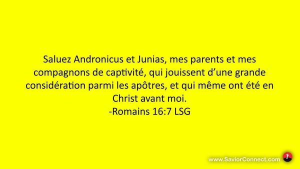 Saluez Andronicus et Junias, mes parents et mes compagnons de captivité, qui jouissent d'une grande considération parmi les apôtres, et qui même ont été en Christ avant moi. -Romains 16:7 LSG