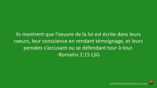 ils montrent que l'oeuvre de la loi est écrite dans leurs coeurs, leur conscience en rendant témoignage, et leurs pensées s'accusant ou se défendant tour à tour. -Romains 2:15 LSG