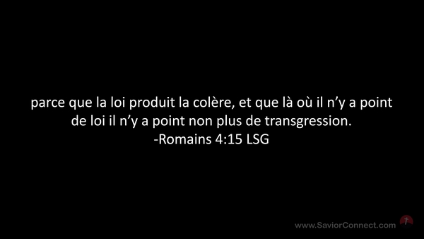 parce que la loi produit la colère, et que là où il n'y a point de loi il n'y a point non plus de transgression. -Romains 4:15 LSG