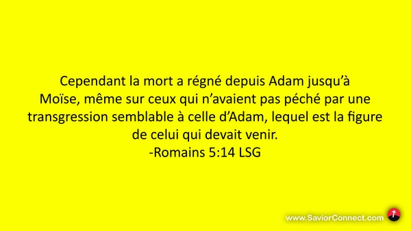 Cependant la mort a régné depuis Adam jusqu'à Moïse, même sur ceux qui n'avaient pas péché par une transgression semblable à celle d'Adam, lequel est la figure de celui qui devait venir. -Romains 5:14 LSG