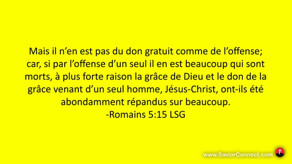Mais il n'en est pas du don gratuit comme de l'offense; car, si par l'offense d'un seul il en est beaucoup qui sont morts, à plus forte raison la grâce de Dieu et le don de la grâce venant d'un seul homme, Jésus-Christ, ont-ils été abondamment répandus sur beaucoup. -Romains 5:15 LSG