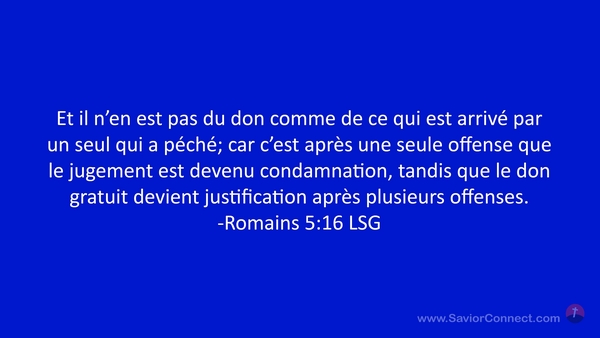 Et il n'en est pas du don comme de ce qui est arrivé par un seul qui a péché; car c'est après une seule offense que le jugement est devenu condamnation, tandis que le don gratuit devient justification après plusieurs offenses. -Romains 5:16 LSG