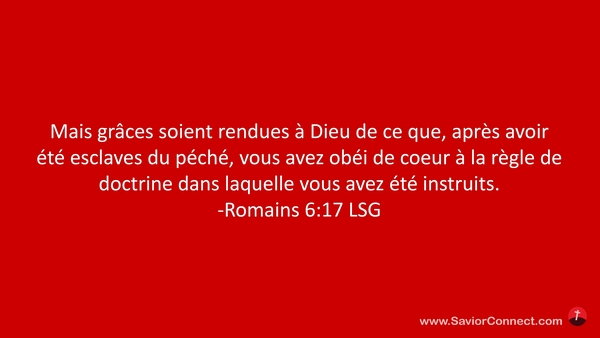 Mais grâces soient rendues à Dieu de ce que, après avoir été esclaves du péché, vous avez obéi de coeur à la règle de doctrine dans laquelle vous avez été instruits. -Romains 6:17 LSG