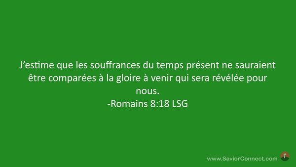 J'estime que les souffrances du temps présent ne sauraient être comparées à la gloire à venir qui sera révélée pour nous. -Romains 8:18 LSG