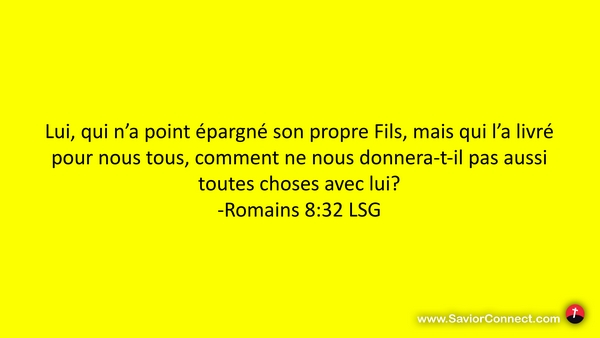 Lui, qui n'a point épargné son propre Fils, mais qui l'a livré pour nous tous, comment ne nous donnera-t-il pas aussi toutes choses avec lui? -Romains 8:32 LSG